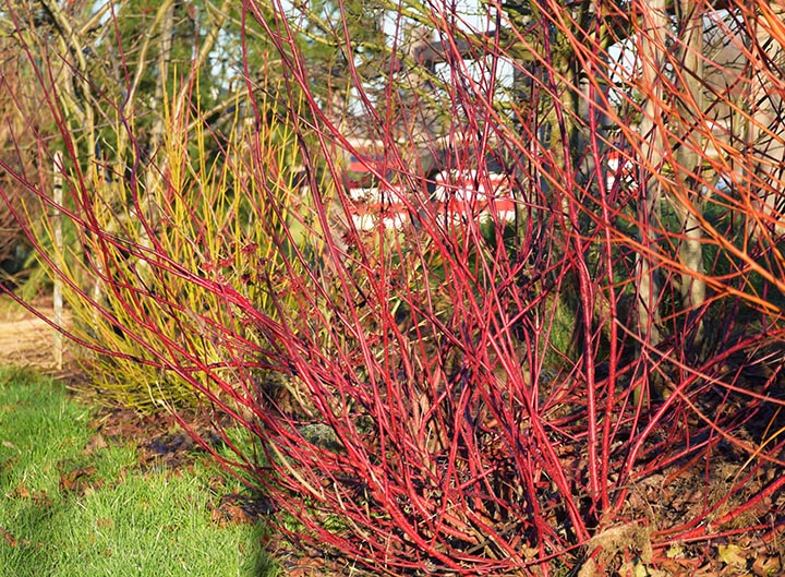 13 janvier 2022 – Cornus alba ‘Siberica’ et en arrière-plan, Cornus cirecea ‘Flaviramea’