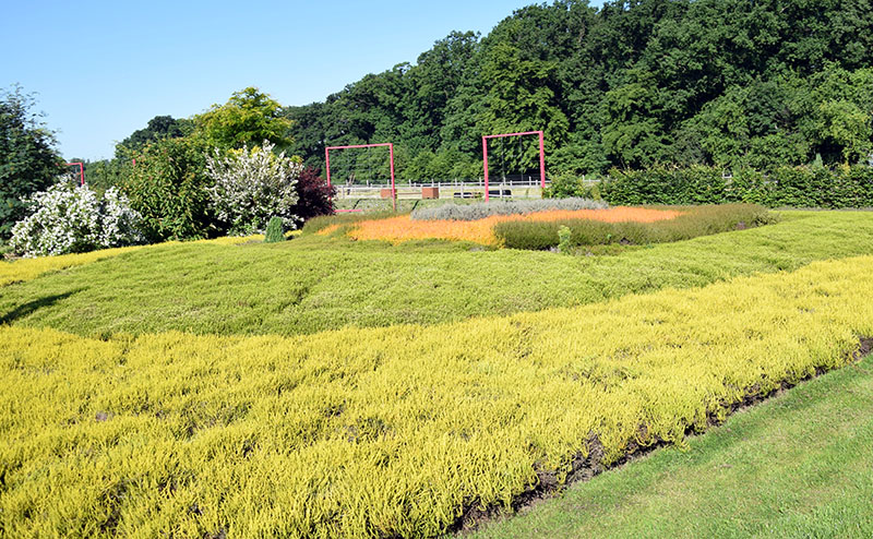 En juin 2022, grand à-plat de bruyère. Au premier plan, Calluna vulgaris »Sandy ».