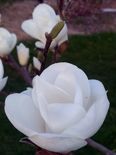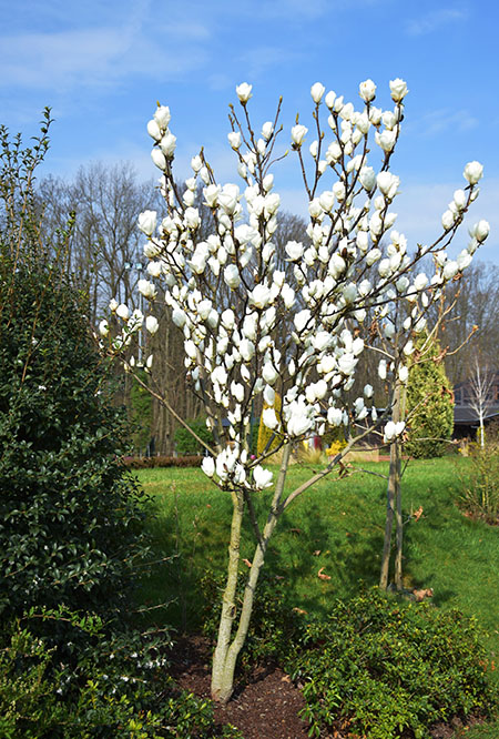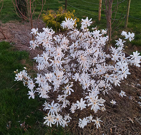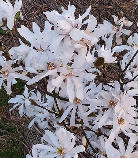 Le raffiné Magnolia stellata s’épanouit en étoiles blanches. Spectacle délicat qui dure moins que le temps des roses. Il vient trois à cinq jours avant le M. soulangeana, donc sensible aux froid. Le moindre gel détruit la floraison.