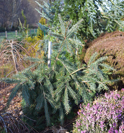 Le Pseudostuga menziesii ‘Glauca Pendula’ du jardin vit sur une terre ingrate. En 5 ans, il ne s’est pas développé normalement. Mais il est sain et nous avons espoir que ses branches finiront par adopter des directions bizarres. La ramure retombante pourrait alors devenir fantastique !