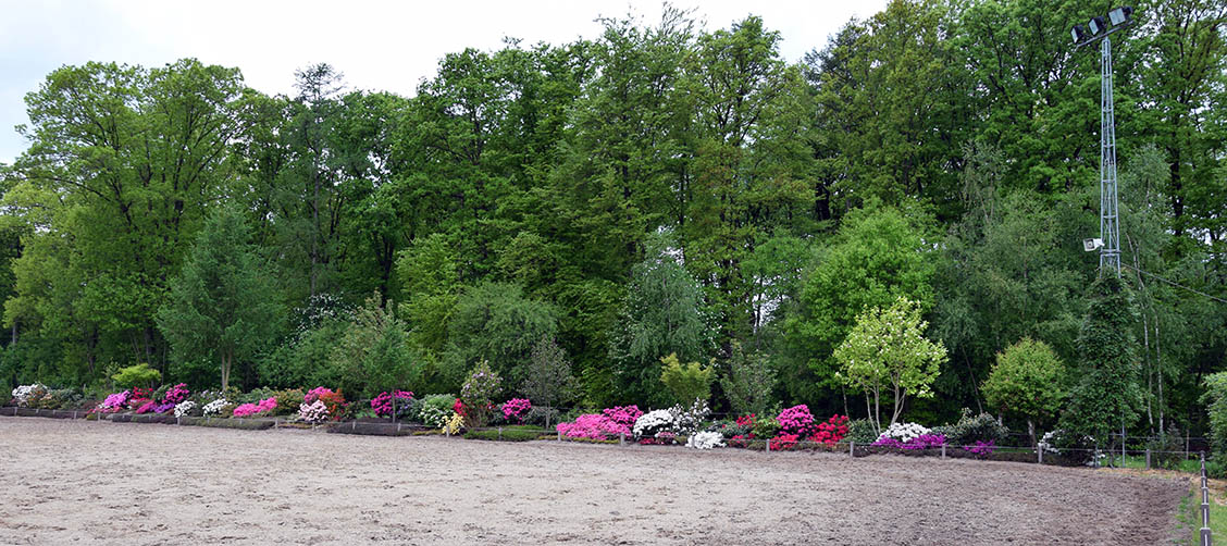 D’abord, nous voulûmes végétaliser deux talus dominant la carrière (l’aire d’évolution extérieure des chevaux). Notre sol acide convenait aux rhododendrons, des arbustes enthousiasmants. Ils devinrent nos premiers essais. A l’origine herbeuse, la surface à couvrir s’étalait sur 500 m2 .